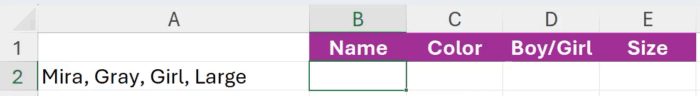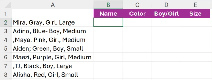 Let’s look at a basic application. In this case we have a student and preference for color, size, etc. for a t-shirt. We want to break the data out of a single cell and into multiple columns. We will use =TEXTSPLIT(). Here is the syntax: