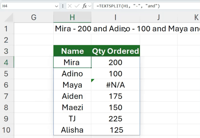 Since we want to create a new row for each name we will use the “and” as a delimiter. That’s right, with =TEXTSPLIT() you can use a word as a delimiter also!