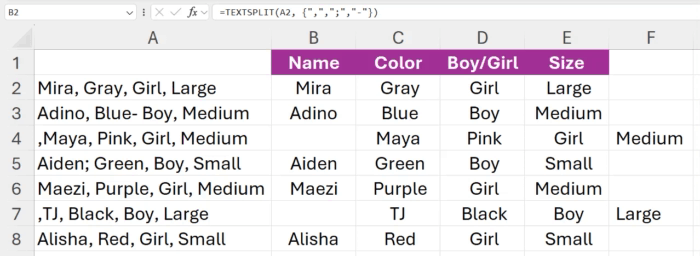As we all know data cleaning is not always this simple. While we would always expect the delimiter to be the same that isn’t what always ends up happening. There will always be data that gets messy with multiple delimiters. Luckily for us =TEXTSPLIT() is designed to handle that. In the following example I applied the above formula to this set of data. Here is what resulted: