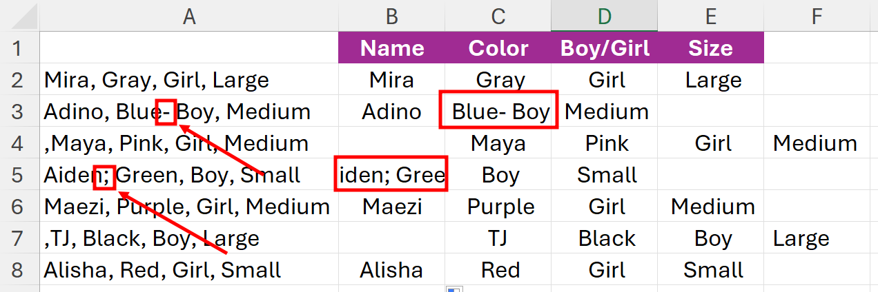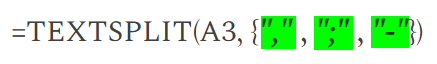 As you can see in these two rows it looks like there are other delimiters. In this case a “-” and a “;”. This is easy to fix - we can adjust our syntax to include multiple delimiters. We will be adding curly brackets inside of our syntax. This indicates to the function that it should look for multiple delimiters. Then we will list out the delimiters. Each delimiter will be entered in quotation marks and separated by a comma. Yes, it will hurt your eyes to look at. I made sure to highlight each delimiter to make it easier to read. Here is the syntax: